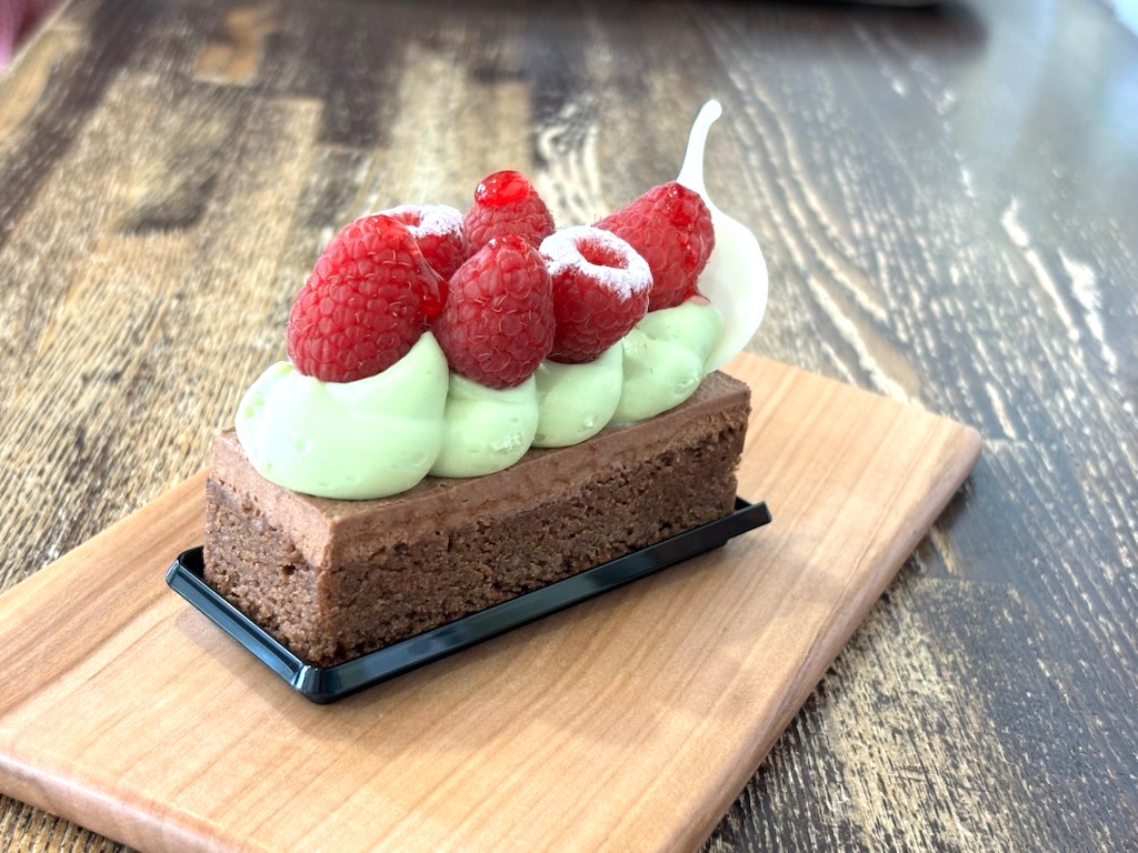 ブラウニーを土台にピスタチオのクリームとフランボワーズ